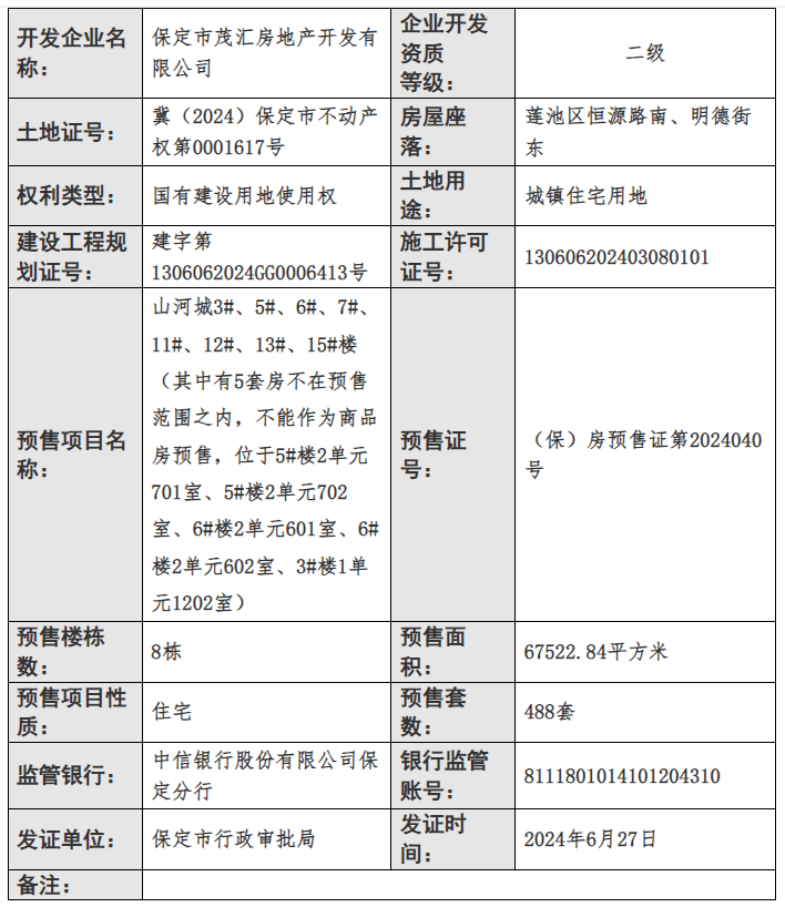 山河城项目3#、5#、6#、7#、11#、12#、13#、15#楼商品房获预售,共8栋楼,其中有5套房不在预售范围之内,不能作为商品房预售,位于5#楼2单元701室、5#楼2单元702室、6#楼2单元601室、6#楼2单元602室、3#楼1单元1202室。商品房预售证号(保)房预售证第2024040号,预售面积67522.84平方米,预售套数488套。