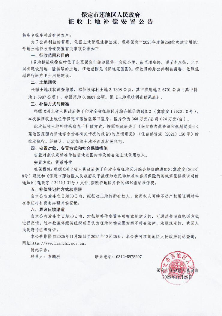 近日,保定市莲池区公布了两则征地补偿安置方案公告,拟征收土地用于供电用地建设和医疗卫生用地建设。
