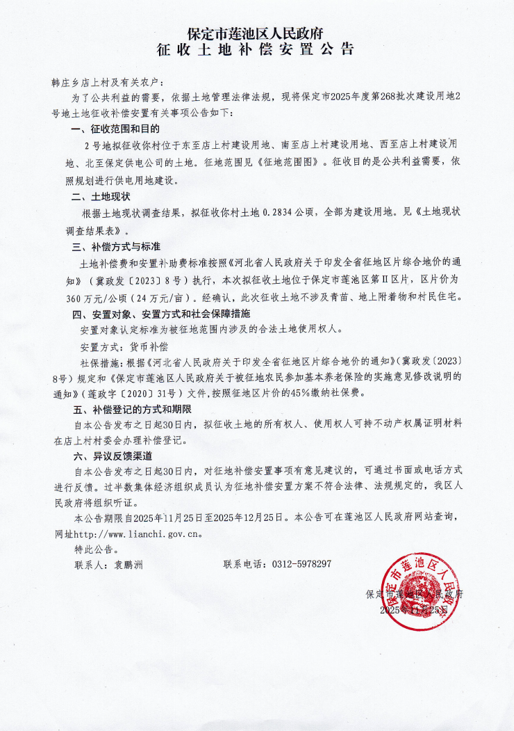 保定莲池区发布征收土地偿安置公告 涉及店上村、徐庄村