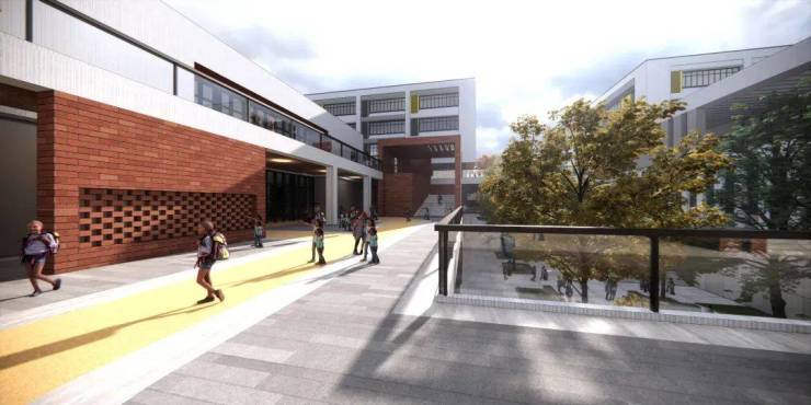 在学校弹性空间体系里,设置了风雨操场、图书馆、报告厅、专用教室、合班教室、篮球馆、羽毛球馆、课外拓展空间、屋顶活动平台、地下车库、连廊、下沉庭院等室外附属工程。
