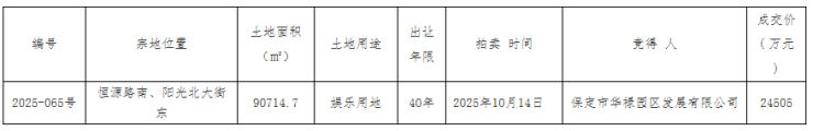 2025年10月15日,保定市公共资源交易中心公布国有建设用地使用权拍卖出让结果。公示显示,主城区1宗娱乐用地成功出让,由保定市华禄园区发展有限公司成功竞得,地块位于恒源路南、阳光北大街东,面积约136.07亩,成交价为24505万元。
