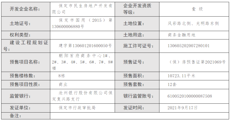 2021年9月19日,保定市行政审批局发布商品房预售公告,朝阳首府商务中心1-8#楼获预售证,预售栋数8栋楼,预售面积10723.11平米,预售套数12套。预售证号:(保)房预售证第2021069号。