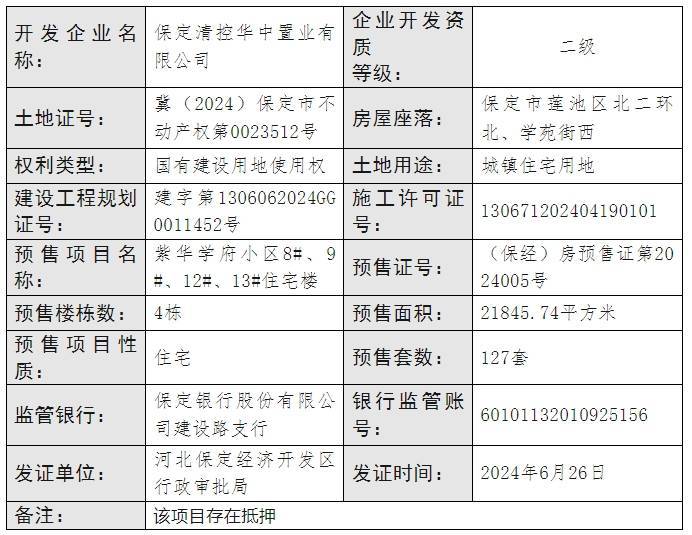 2024年6月26日,河北保定经济开发区行政审批局公布了一则商品房预售许可证下发信息,紫华学府小区8#、9#、12#、13#住宅楼获发预售证,预售面积21845.74平方米,预售套数127套,预售证号 (保经)房预售证第2024003号。
