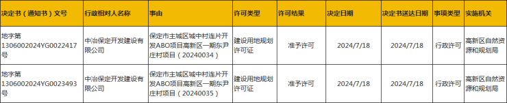 2024年7月18日,保定国家高新技术产业开发区管理委员会官网公布中中冶保定开发建设有限公司保定市主城区城中村连片开发ABO项目高新区一期东尹庄村项目(20240034)(20240035)建设用地批后公示。