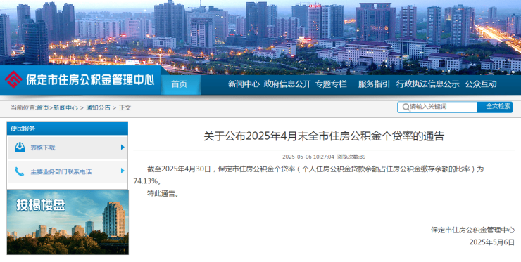 2025年5月6日, 保定市住房公积金管理中心公布4月末全市住房公积金个贷率。 截至 2025年4月30日,保定市住房公积金个贷率(个人住房公积金贷款余额占住房公积金缴存余额的比率)为74.13%。