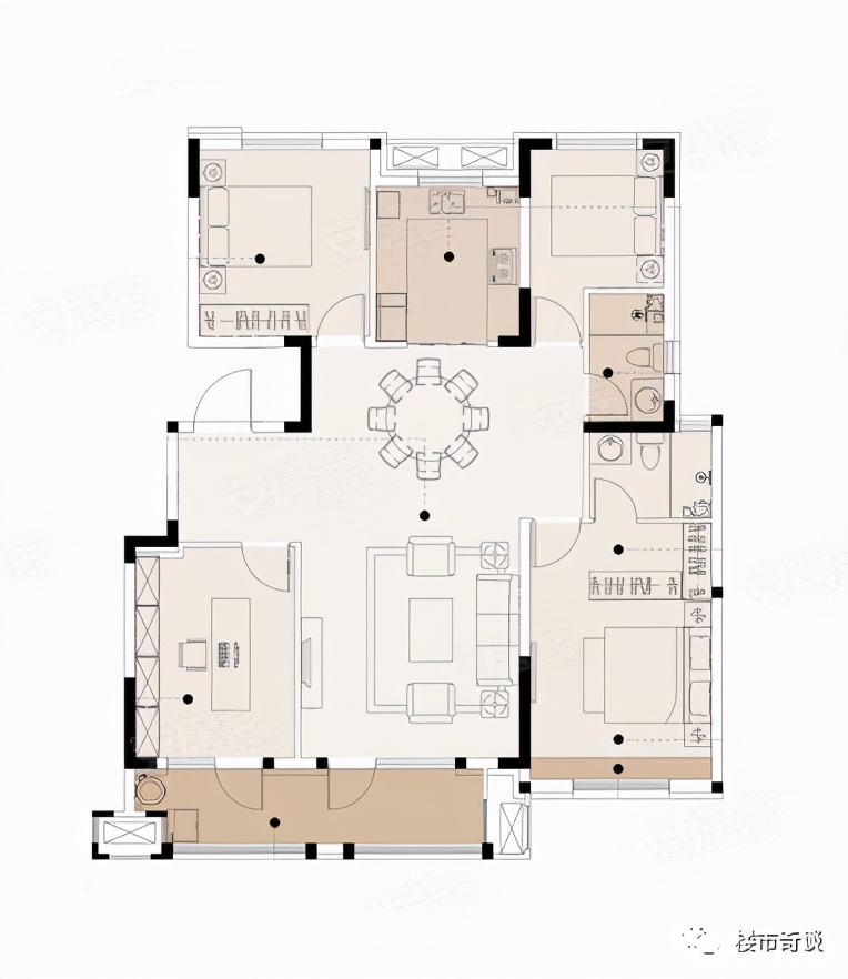 你可以说是四居室,但是如果你家里没有那么人居住的化,可以变成客厅开间近10米的三居室,甚至还可以改成五星级酒店时的豪华两居套房,也就是说无论是二人世界、三口之家还是四世同堂,都能在这个户型中得到向往的空间。