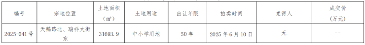 2025年6月11日,保定市公共资源交易中心发布国有建设用地使用权拍卖出让结果公示,2025-041号中小学用地流拍。该地块位于天鹅路北、瑞祥大街东,面积31693.9㎡,约47.54亩。