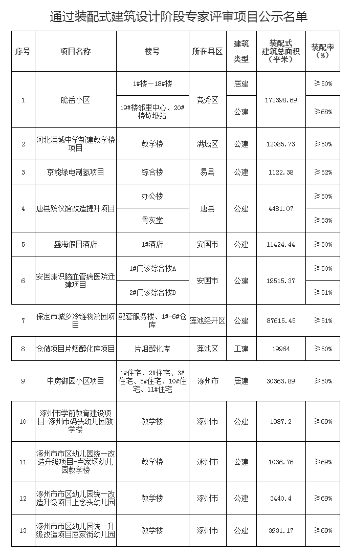 经项目建设单位申请,我局建筑产业现代化促进中心组织专家对保定市瞻岳小区等项目(具体名单附后)进行了装配式建筑设计阶段装配率及关键性技术专家评审。现以上项目经专家组认定符合河北省《装配式建筑评价标准》要求,通过设计阶段专家评审。