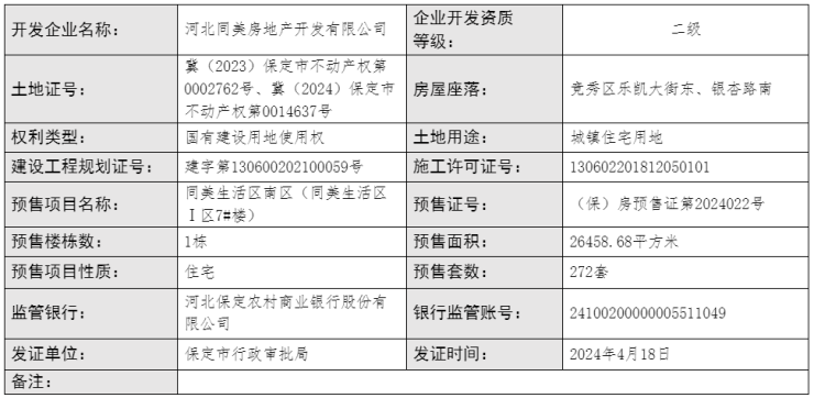 同美生活区南区(同美生活区Ⅰ区7#楼)预售面积26458.68平方米,预售套数272套,预售证号:(保)房预售证第2024022号。