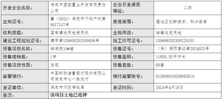 御湖苑10#楼预售面积11895.92平方米,预售套数68套,预售证号:(保)房预售证第2024023号。