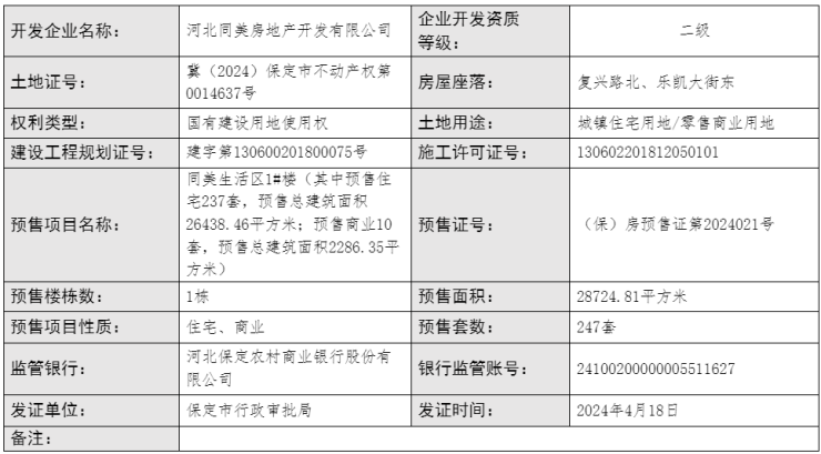 其中同美生活区1#楼预售面积28724.81平方米、预售套数247套,其中预售住宅237套,预售总建筑面积26438.46平方米;预售商业10套,预售总建筑面积2286.35平方米。预售证号:(保)房预售证第2024021号。