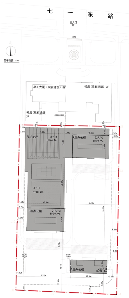 项目位于东三环以东,七一路以南,规划用地面积为25714.6平方米(约38.57亩),规划用地性质为商业服务业设施用地。规划条件为:容积率≤3.5,建筑密度<50%,绿地率≥20%。项目总建筑面积约14.11万平方米,其中:地上建筑面积约9.01万平方米,地下建筑面积约5.1万平方米,其它控制指标均符合规划要求。