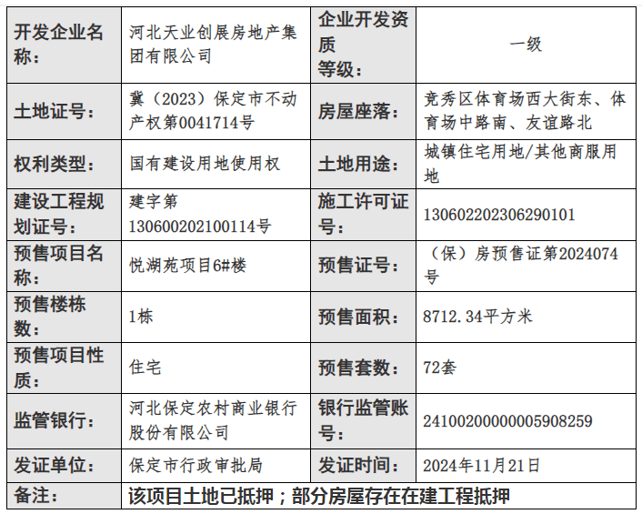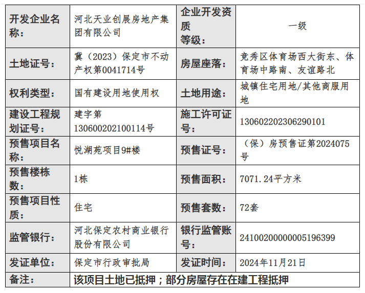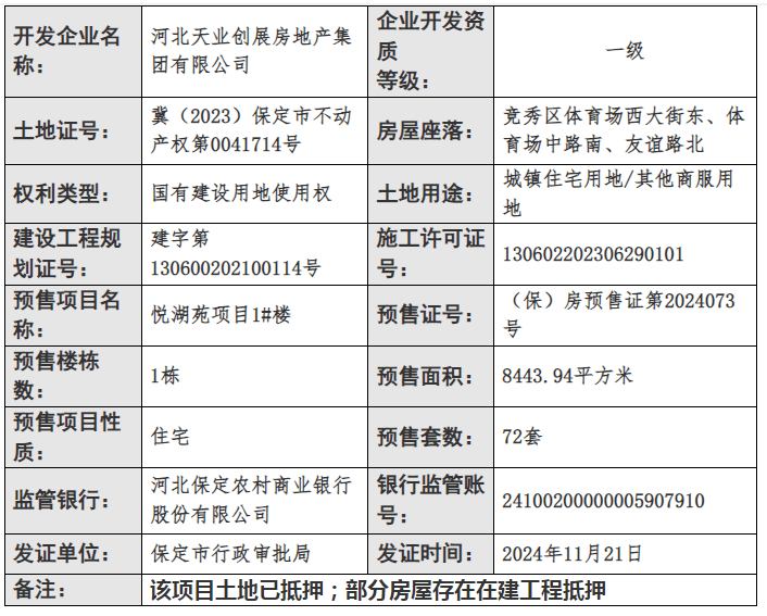 证件丨保定天业·悦府项目3栋住宅获预售 总预售房源216套