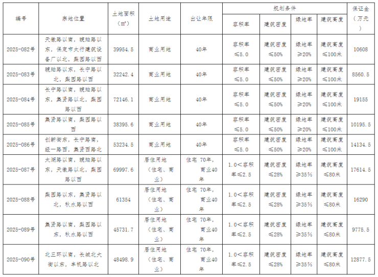 2025年12月20日,保定市公共资源交易中心发布公告,以拍卖方式出让主城区9宗国有建设用地使用权。此次推出的地块包括5宗商业用地,4宗居住用地。出让总面积461555.3㎡,约692.33亩。 此次出让地块在规划设计方面有明确要求。根据公告,所有居住用地可以设置商业设施,但商业设施只能与邻里中心合建,特别规定不得以住宅底商形式建设。