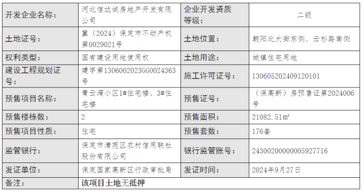2024年9月27日,保定国家高新区行政审批局公布了一则商品房预售许可证下发信息,青云湾项目获发预售证,预售面积21082.51平方米,预售套数176套,预售证号(保高新)房预售证第2024006号。