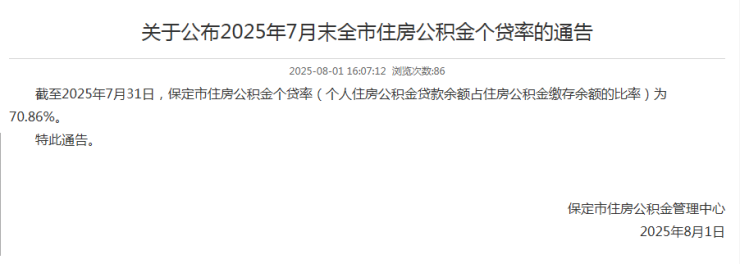 2025年8月1日,保定市住房公积金管理中心公布7月末全市住房公积金个贷率。截至2025年7月31日,保定市住房公积金个贷率(个人住房公积金贷款余额占住房公积金缴存余额的比率)为70.86%。…