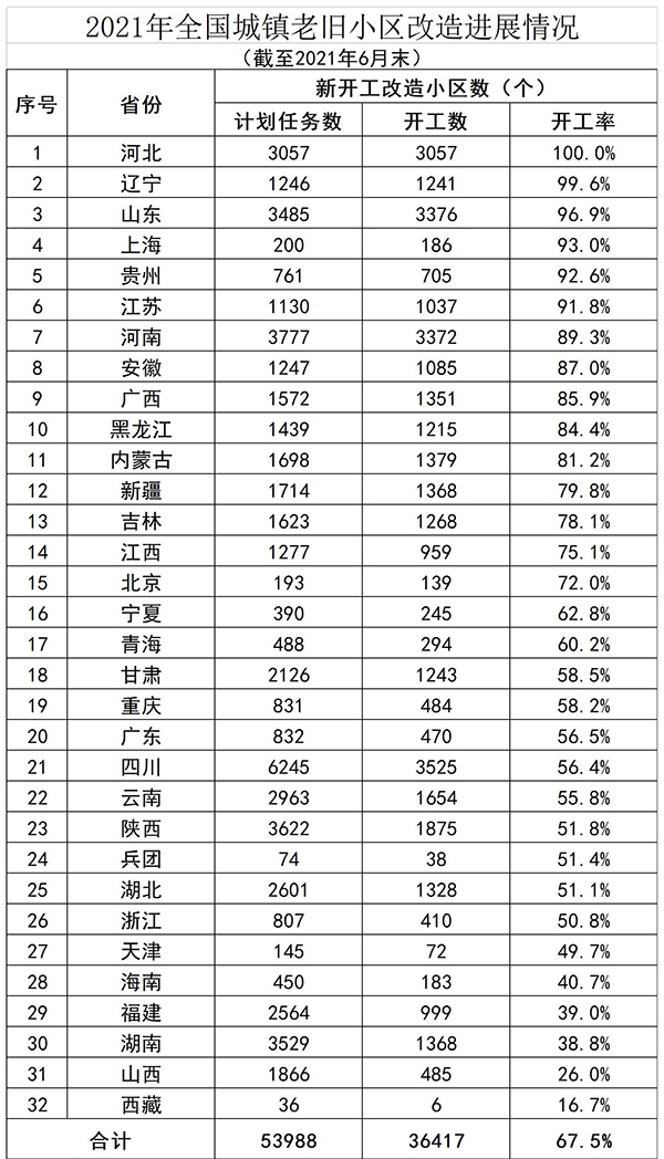 今年1—6月份,全国新开工改造城镇老旧小区3.64万个,占年度目标任务(5.3万个)的67.5%,较5月末增加了25.1个百分点。