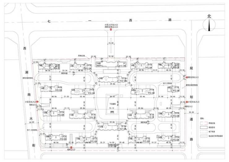 项目位于七一西路南、西湖南大街东,规划用地面积71430.90平方米(约107亩),规划用地性质为居住用地。总建筑面积约22.76万平方米,其中地上约15.76万平方米,地下约7.00万平方米。容积率2.21、建筑密度17.10%、绿地率36.75%,其他控制指标符合规划要求。