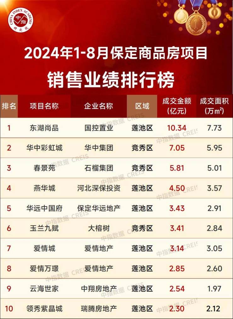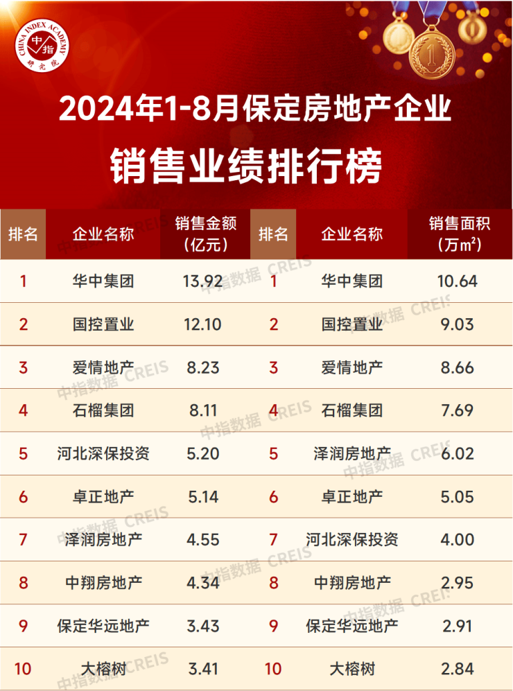 中指院丨2024年1-8月保定房地产企业销售业绩TOP10
