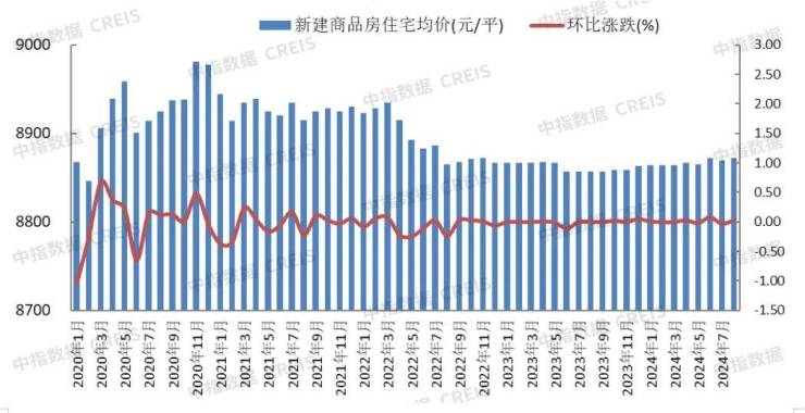 图:2020年-2024年8月保定新建商品住宅销售均价及环比走势