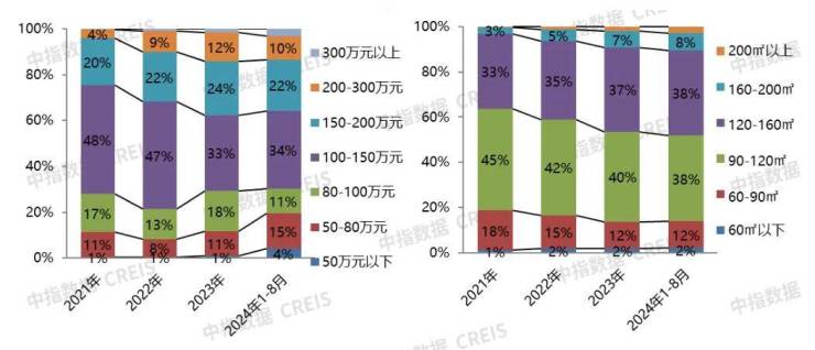 从成交结构来看,2024年1-8月,总价段80-100万、面积段在90-120平之间产品成交占比下滑明显。成交总价段,100-150万之间产品成交占比34%,较2023全年增加1.0个百分点,居首位;150-200万之间产品成交占比为22%,较2023全年减少1.4个百分点,居第次席;50-80万之间产品成交占比较2023全年增加4.8个百分点至15%,居第三位;80-100万之间产品成交占比为11%,较2023年减少6.9个百分点;50万以下产品成交占比约为4%,较2023全年增加3.1个百分点;200万以上豪宅项目成交套数占比微降。成交面积段,90-120平之间产品成交占比为38.1%,居首位,但占比延续回落趋势;120-160平之间产品成交套数占比居次席,占比为37.6%,占比小幅增加;90平以下产品成交套数占比约为14%,较去年基本持平;160平以上高端改善产品成交占比约为11%,较2023全年增加1.1个百分点。