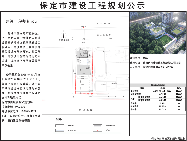 葛杨拟在保定市竞秀区七一西路以南,竞技路以北建设葛杨乒乓球训练基地建设工程项目。建设单位已委托设计单位按城市规划要求、相关规定、建筑设计规范等进行方案设计,现将总平面图及效果图予以公示。