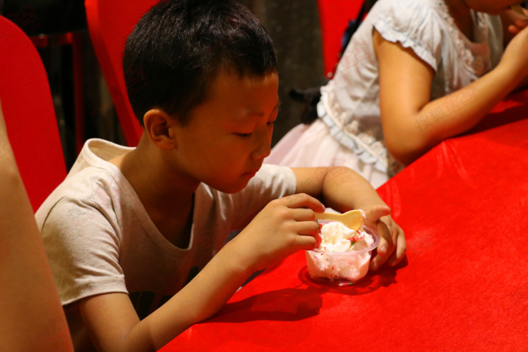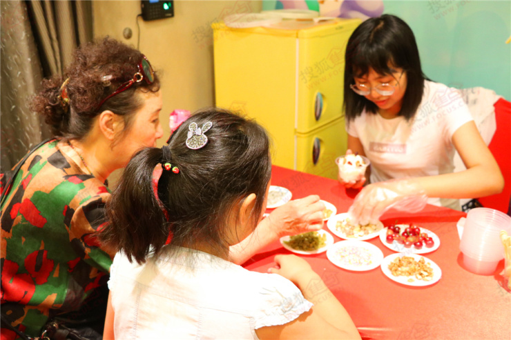 冰淇淋DIY活动深受小朋友们喜爱,爆米花、火龙果、葡萄干、腰果、樱桃……看到满桌丰富新鲜的食材,小朋友们垂涎欲滴。用抹茶味儿、草莓味儿等种类丰富的冰淇淋做打底,配上各种食材,孩子们捧着冰淇淋大快朵颐,并伸出小手要求小编为他们拍照留念。