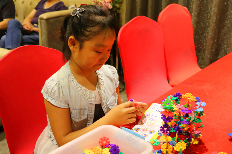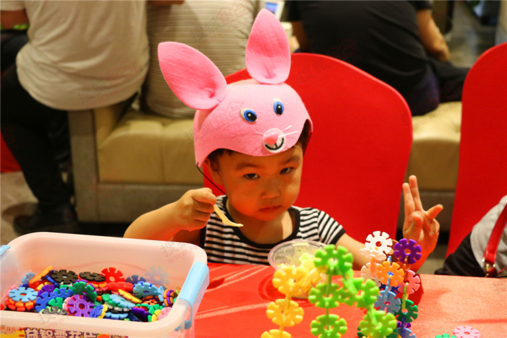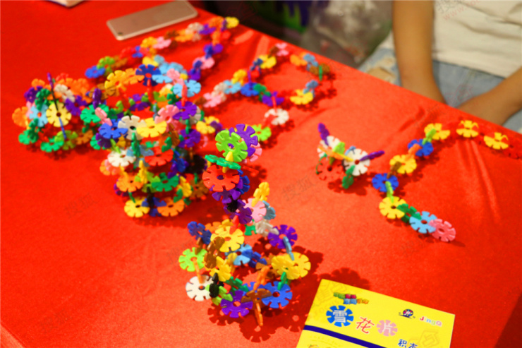 雪花插片拼造型,是将五颜六色的雪花片,以不同角度和方位的拼插后组成一定形状,能够锻炼孩子们的动手动脑能力。有的小朋友们或灵活迅速,或从容不迫,帆船、小动物、房子、滑梯、秋千、跷跷板、花朵……一个个生动的形象在孩子们丰富的创造力下跃然显现。