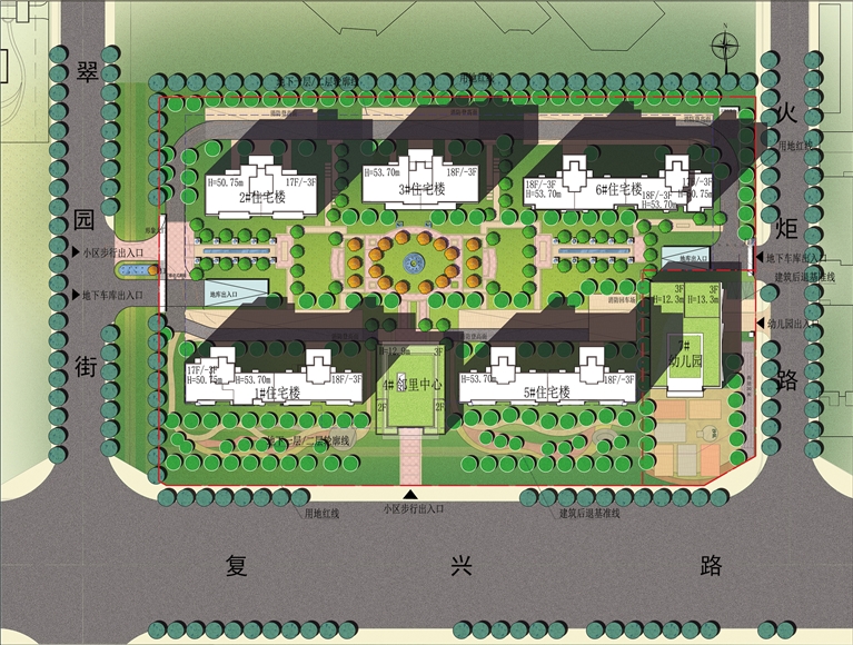 项目位于复兴路北侧、翠园街东侧、火炬路西侧,用地面积22884.7平方米(约34.33亩),于2021年2月19日通过招拍挂方式取得土地使用权,规划用地性质为居住用地,出让合同容积率不高于2.5,不低于1。规划设计条件为:容积率≥1.0且≤2.5,建筑密度≤20%,绿地率≥35%。总建筑面积约9.14万平方米,其中:地上建筑面积约5.7万平方米,地下建筑面积约3.44万平方米,包括5栋住宅楼、1栋6班幼儿园、1栋邻里中心,其它控制指标均符合规划要求。