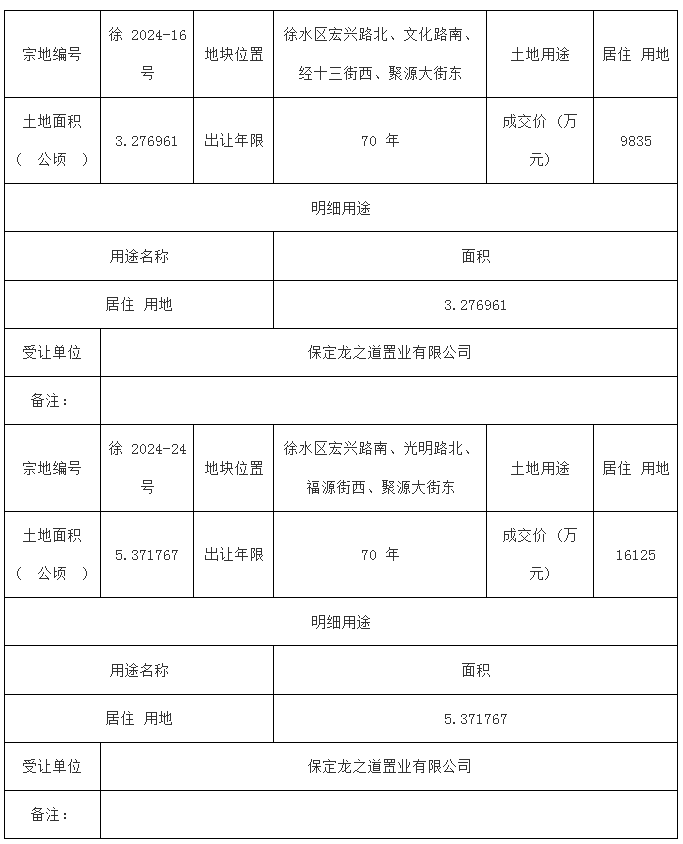 公示丨保定徐水区2宗地块挂牌出让结果公示 龙之道置业拿地