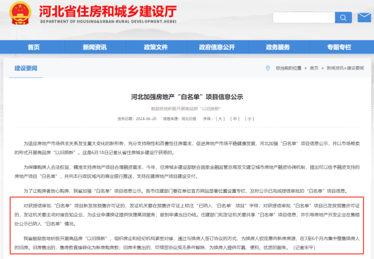 河北省住建厅6月18日发布《关于加强“白名单”项目信息公示和积极开展商品住房“以旧换新”工作的通知》。要求各市住建部门要在单位官方网站显著位置设置专栏,及时公示已完成授信审批的“白名单”项目信息。