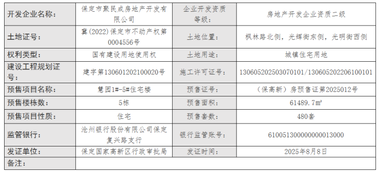 2025年8月8日,保定国家高新区行政审批局公布了最新商品房预售许可证下发信息,慧园项目1-5#楼商品房获发预售证,预售面积61489.7平方米,预售套数480套,预售证号(保高新)房预售证第2025012号。…