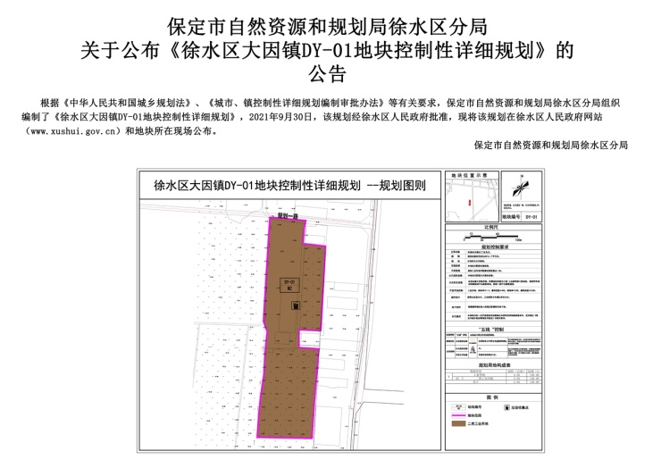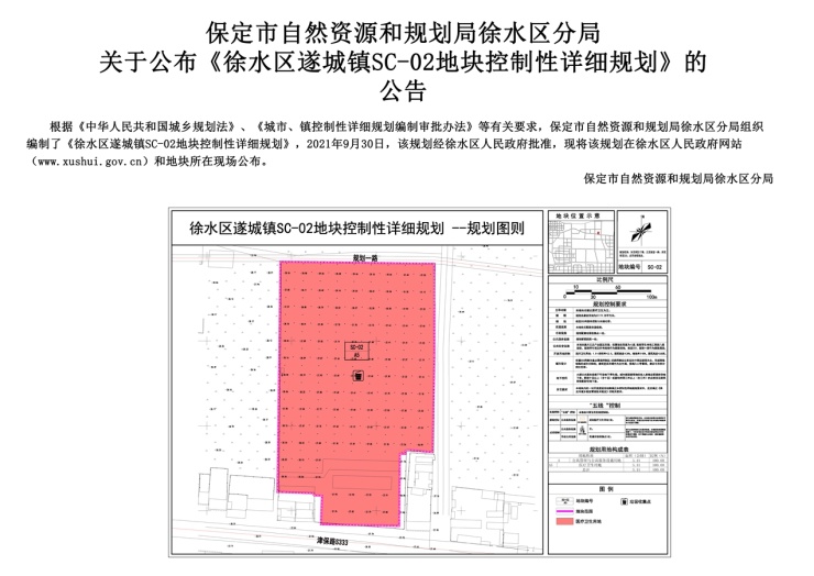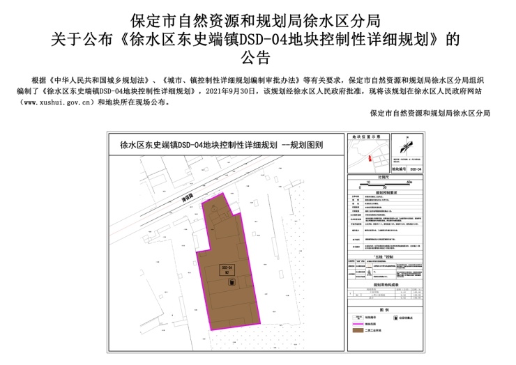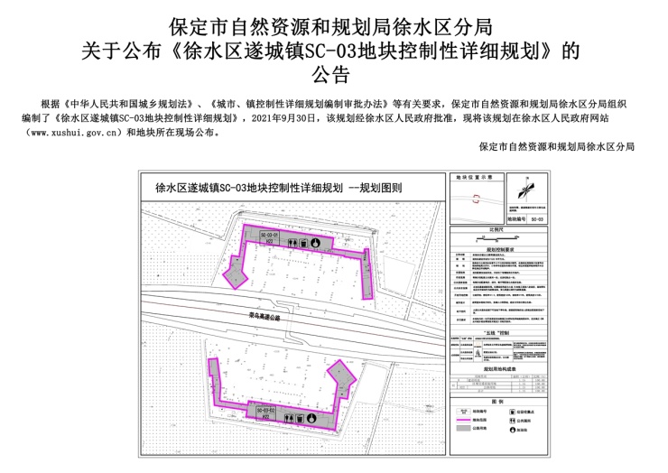 根据《中华人民共和国城乡规划法》、《城市、镇控制性详细规划编制审批办法》等有关要求,保定市自然资源和规划局徐水区分局组织编制了《徐水区安肃镇AS-01地块控制性详细规划》、《徐水区大因镇DY-01地块控制性详细规划》、《徐水区东史端镇DSD-04地块控制性详细规划》、《徐水区高林村镇GLC-02地块控制性详细规划》、《徐水区遂城镇SC-02地块控制性详细规划》、《徐水区遂城镇SC-03地块控制性详细规划》等城市规划区外6个地块控制性详细规划方案,2021年9月30日,6个地块控制性详细规划方案经徐水区人民政府批准,现将《徐水区安肃镇AS-01地块控制性详细规划》等城市规划区外6个地块控制性规划方案在徐水区人民政府网站(www.xushui.gov.cn)和地块所在现场公布。