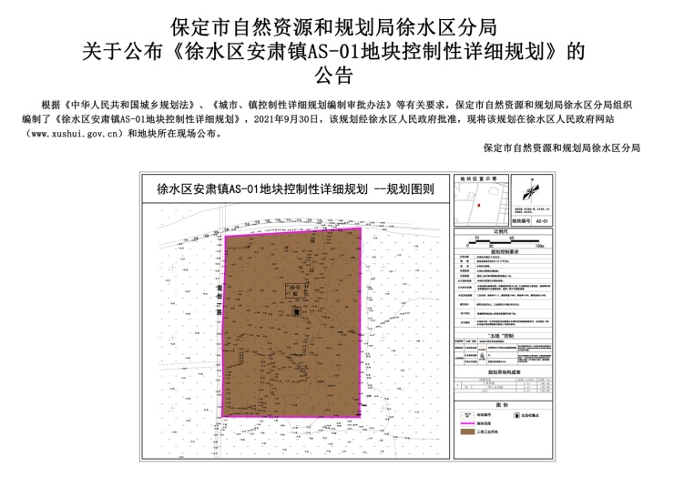 2021年9月30日,6个地块控制性详细规划方案经徐水区人民政府批准,现将《徐水区安肃镇AS-01地块控制性详细规划》等城市规划区外6个地块控制性规划方案在徐水区人民政府网站(www.xushui.gov.cn)和地块所在现场公布。