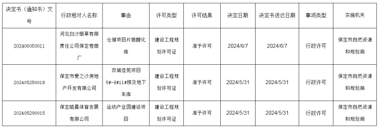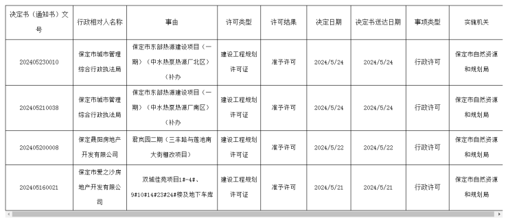 2024年6月13日,保定市自然资源和规划局公布最新建设工程规划许可证下发情况,保定市东部热源建设项目(一期)(中水热泵热源厂北区)(补办、保定市东部热源建设项目(一期)(中水热泵热源厂南区)(补办)、君岚园…