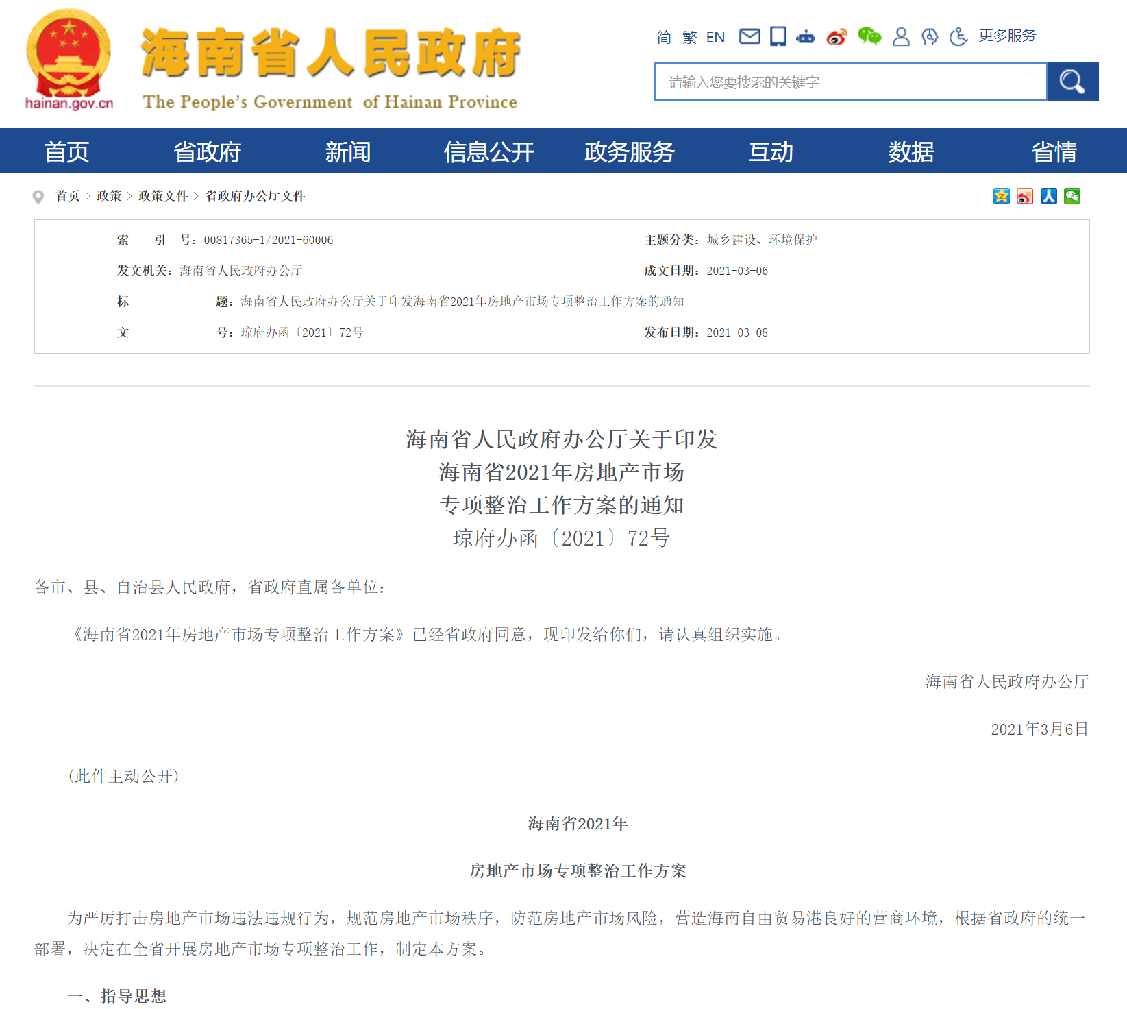 3月8日,据海南省人民政府网站发布《关于印发海南省2021年房地产市场专项整治工作方案的通知》(以下简称《通知》)要求,全面清理整治房地产企业和中介机构违法违规行为,严厉打击规避限购政策骗购、变相涨价、违规销售等违法违规行为。