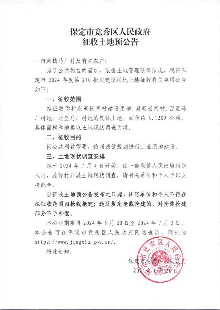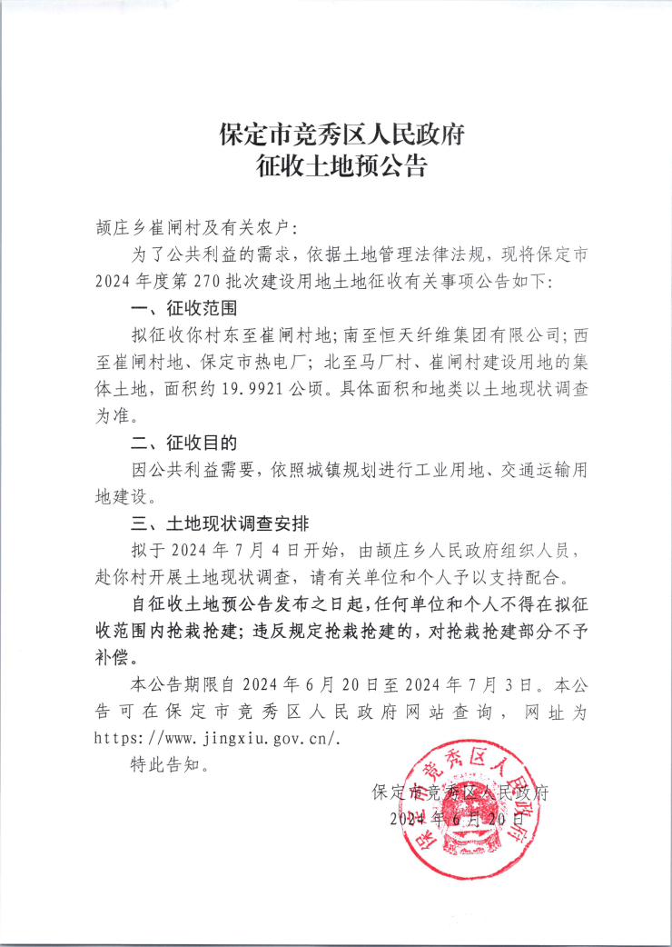 公告丨保定竞秀区发布崔闸村、马厂村征收土地预公告