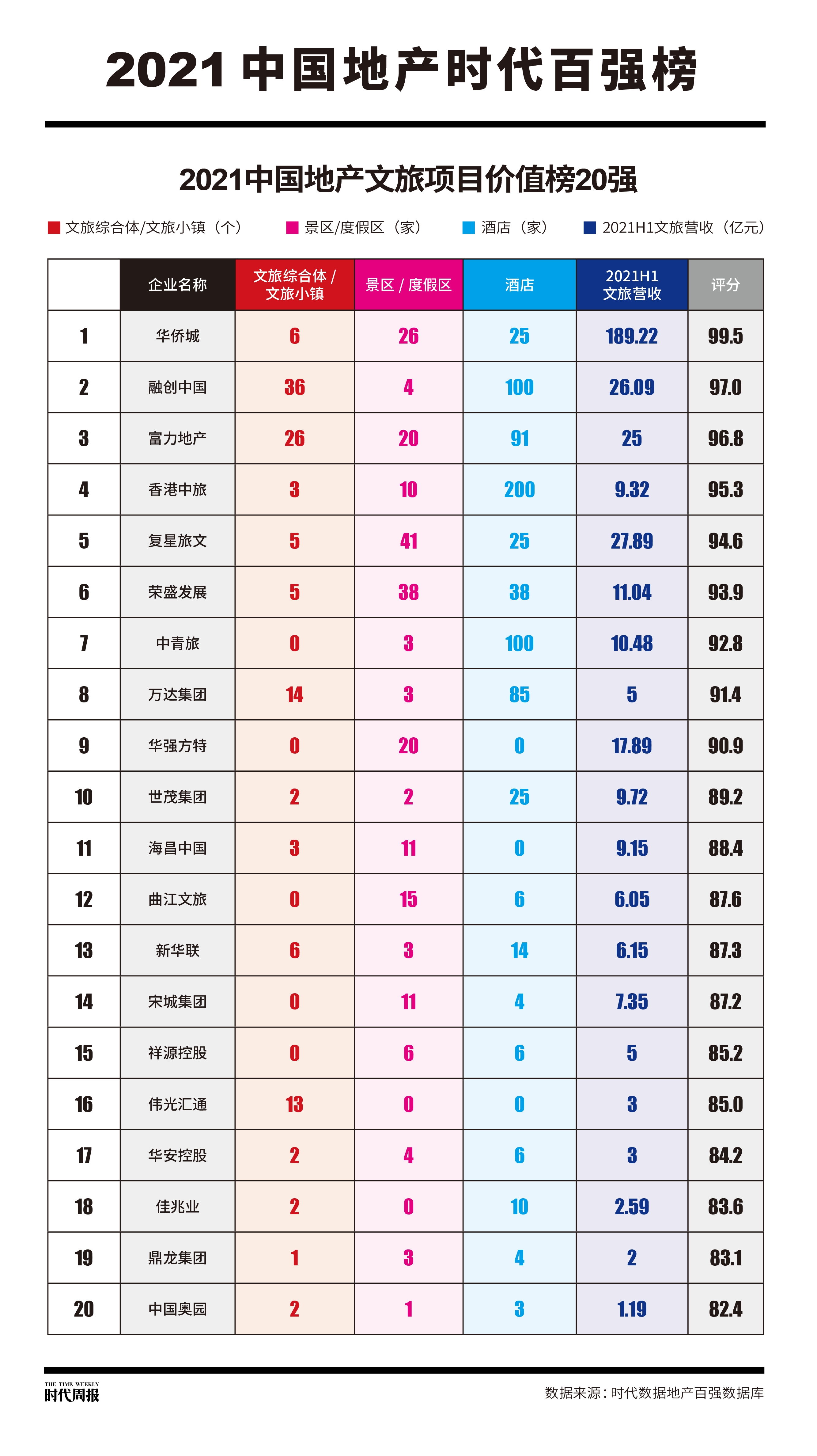11月10日,时代传媒2021中国地产时代百强榜的子榜《2021中国地产文旅项目价值榜20强》榜单(下称《榜单》)出炉,依托时代传媒旗下的时代数据地产百强数据库,以地产企业在文旅项目上的布局及其环境影响力、运营方面和发展前景综合打分,持续关注文旅地产的未来发展方向。
