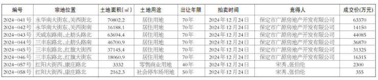 2024年12月24日,保定市公共资源交易中心公布了一则国有建设用地使用权拍卖出让结果公示,主城区8宗居住用地成功出让,保定市广源房地产开发有限公司摘得6宗居住用地,1宗地块为零售商业用地和1宗地块为社会停车场用地由自然人宋秀、张伯伦摘得 。