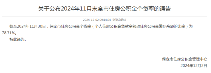 2024年12月2日, 保定市住房公积金管理中心公布11月末全市住房公积金个贷率。截至2024年11月30日,保定市住房公积金个贷率(个人住房公积金贷款余额占住房公积金缴存余额的比率)为78.71%。